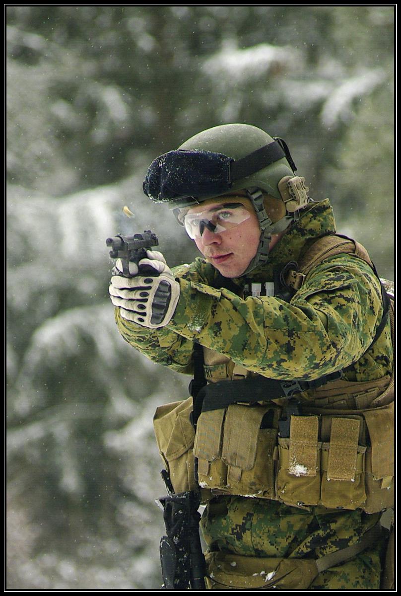Moje výstroj vhodná na jednodenní airsoft...   Oblečení: Na sobě mám taktické nehořlavé maskáče FROG II v kamufláži digital 3color desert doplněné o kšiltovku ve stejné kamufláži. Na batohu mám připnutý svrchník, který ochrání před deštěm a větrem, od firmy Orc industries. Na nohou mám kanady od fy Baťas. Shemagh mi chrání krk před větrem. Vesta: Taktický plejtkerýr od fy Eagle industries s FSBE2 taktickými sumkami. Na vestu je připojena sumka na 3-6 zásobníků k pušce M16. Na této sumce jsou našity průvleky MOLLE, čili se na ní dají dát, jako je to i v mém případě, další taktická pouzdra. Já jsem tuto sumku osadil dvojicí sumek na zásobníky M16, které dohromady pojmou až 4 zásobníky. Dále na plejtkerýru mám pouzdra na granáty (dají se skvěle využít na cigarety). Vedle je sumka na zdravotní materiál, která je vhodná na kuličky (vejde se do ní balíček s 3000bbčkama, které se hodí, když vystřílíte všechny 300 raňáky). Poslední viditelná sumka je sumka na rádio. Pásek: Na opasku mám taktický FSBE2 odhazovák od fy CSM, vejde se do něj až 8 točáků a ještě papírky od tatranek. A dále na něm nosím další pouzdro AI IFAK, v tom nosím pro případ odložení batohu plechovku coly (tu malou za 10 kč) a nějaký sušenky. Doplňky: Ledvinka od fy CSM je vyborná na osobní doklady, telefon, MP3jku a PSPčko, když je nuda na mrtvolišti, je zde i kapsička kam se vejdou cigára. Na plejtkerýru mám dále nůžky, ty jsou potřebné při otevírání balíčku polomáčenek v rukavicích, které mám od fy Oakley stejně jako brýle. Zbraň: M4 Sopmod s Crejn pažbou a holografickým taktickým zaměřovačem. Vše je nastříkáno barvami Krylon, které sou podle mého vkusu horší než autolaky Škoda. Batoh: Na zádech mám batoh od fy Camelbak typ motherlode v 3 color desert. Batoh je dostatečně velký, takže si s sebou mohu vzít i rozkládací křeslo a veliké množství piva v plechovkách a sušenek a brambůrků. To je tak vše co s sebou nosím na airsoft.