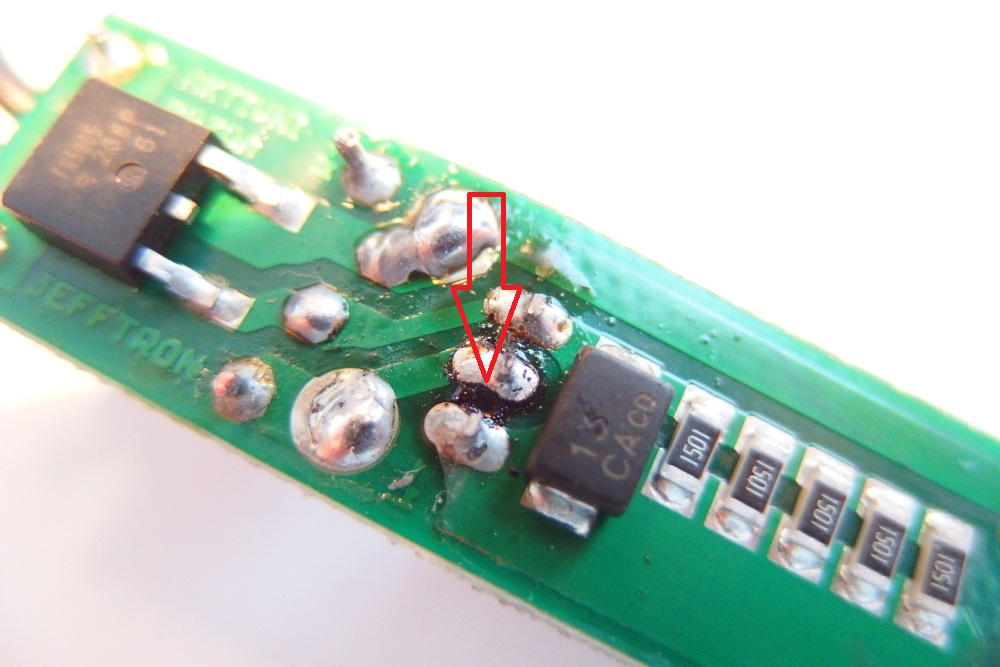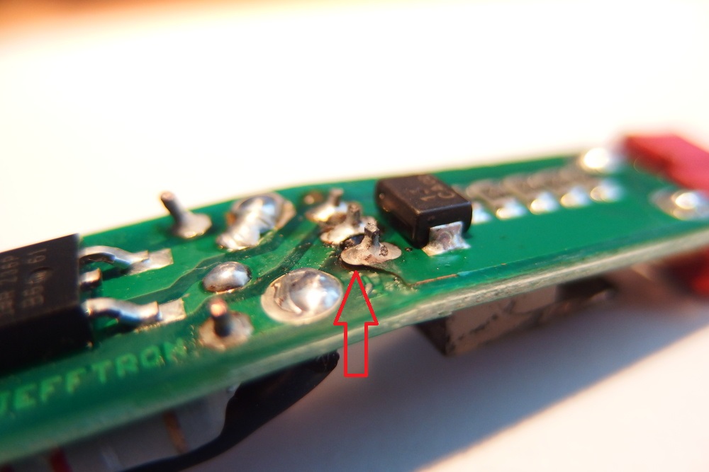 prvni ceho jsem si vsilnul je poskozeni buzirky ve spodni casti aktivni brzdy, nachazi se tam vykonove casti zarizeni, ktere by mohli zpusobit zkrat skrz kovove telo zbrane. po oddelani buzirky jsem zjistil, ze je deska zlomena v oblasti nozicek mosfetu a diky tomu jsou poskozeny vsechny vykonove cesty aktivni brzdy. Aktivni brzda neni navrzena na prime zapajeni deanT konektoru, kdy zakaznik udelal na minusovem polu cca 2mm mustek pouze z cinu. Souctem vsech techto veci se zvysil odpor kabelaze. Kolem vyvodu nozicek mosfetu byly nejake cerne necistoty, nejspis to zpusobyl zbytek tavidla, ktery se hodne ohral behem destrukce mosfetu, tomu neprisuzuji zadny vyznam.