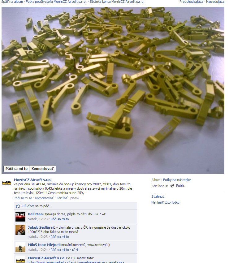 Ni nezabudol , 3. príspevok z dola https://www.facebook.com/photo.php?fbid ... =1&theaterTairo píše: Adam Nemčík : tak dostal som sa konečne k úsťovke a vyzerá to fajn , takže Sa hlboko ospravedlnujem za moje neveriace príspevky kde som vychádzal z mojich doterajších informácií . Tak a teraz ako som spomenul čakám na cenu zbrane a dátum naskladnenia . 4 júna o 21:18 · Páči sa mi to
