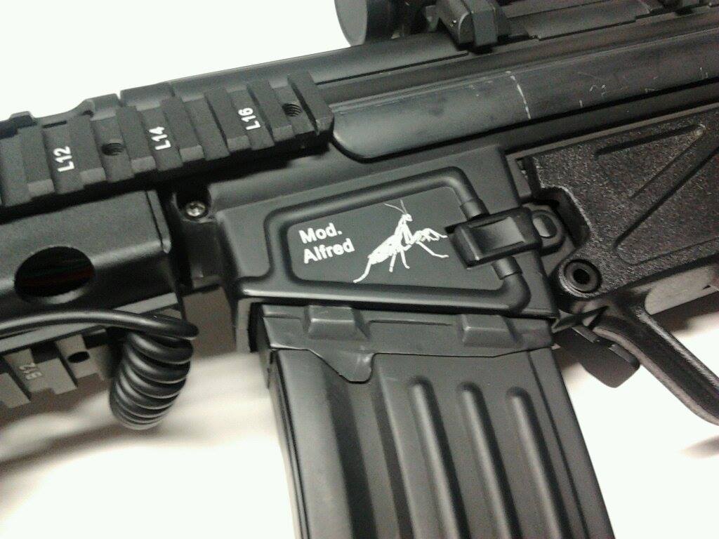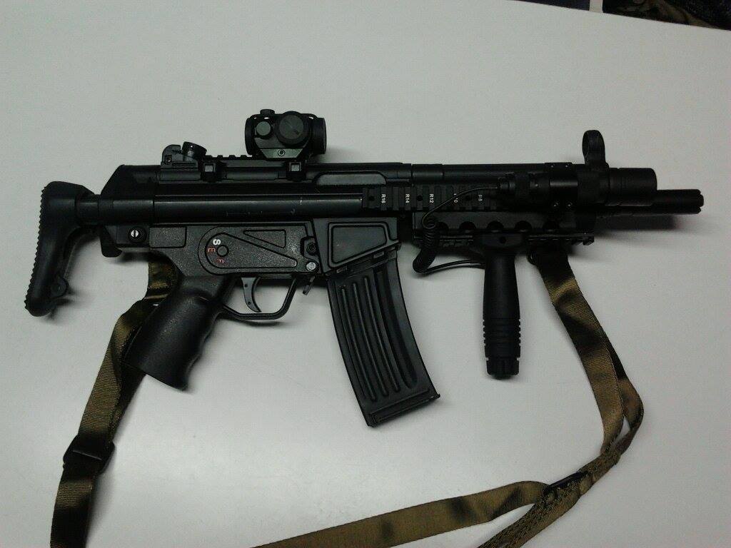 Konečně jsem si postavil vlastní HK53. Určená spíše na střední a kratší vzdálenosti, CQB a noční boj. Základ je CA53 s výsuvnou pažbou (nejblíže ji už měli už jen na Slovensku, jinak vzácné zboží), G&G RIS předpažbí pro G53, lehký upgrade - výkon 115-120 m/s s 0,20g (fak mi to bohatě stačí i do lesa), integrované nasvětlování kuliček, vlastní laserové značení (miluju kudlanky, doma jednu mám). Toužím dát místo ručky granátomet, ale ta hlaveň by to už asi nedala. Je to můj jediný trochu moderní kvér  Příloha: