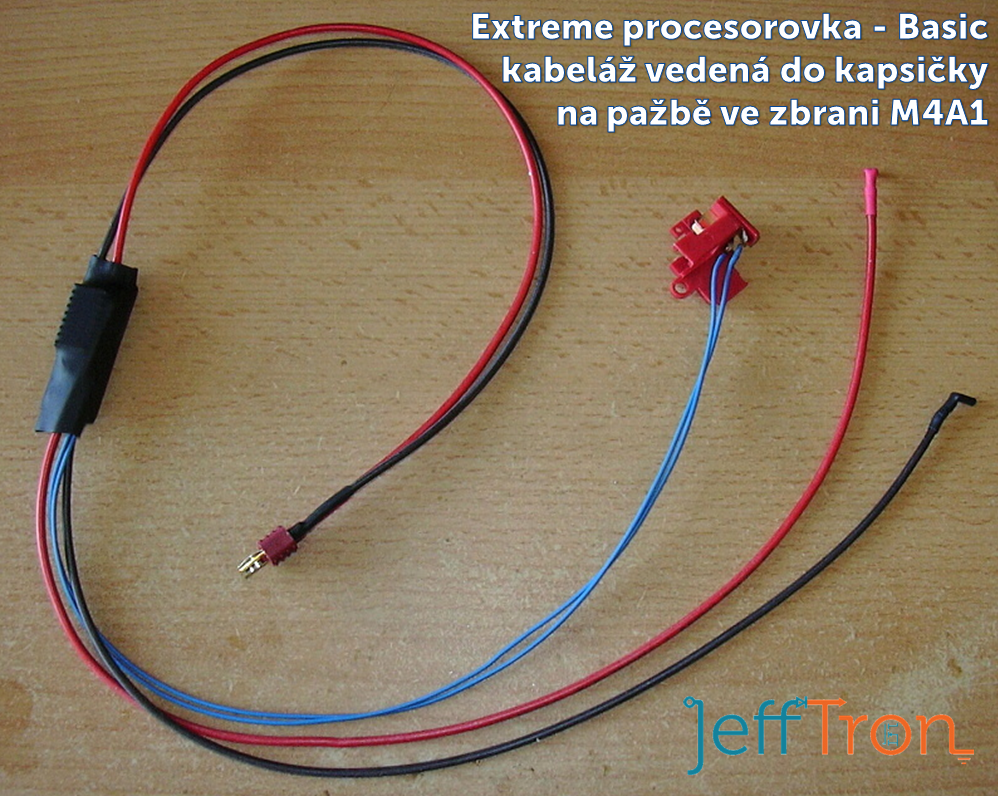 Na fotce je na zakázku vyrobená kabeláž s integrovanou Procesorovkou - V2 u zbraně M4 s baterií v trnu pažby. Díky umístění místo spoušťových kontaktů je dostatek místa pro baterii v trnu pažby. Byl použit ohebnější bílý vodič se silikonovou izolací. Rozpis použitých dílů: 1 ks Procesorovka - V2 s univerzální kabeláží = 1435,00 Kč 1 ks DeanT konektor - samec = 15,00 Kč 1 ks Bílý kabel 0,25 mm2 se silikonovou izolací = 18,00 Kč 1 ks Bužírka 3,2mm mix - 2 ks = 2,00 Kč 1 ks Bužírka 3,2mm červená - 2 ks = 2,00 Kč 2 ks Faston dutinka 2,8mm - 2ks = 16,00 Kč 1 ks Plochá pojistka mini - 30A = 7,00 Kč 1 ks Kompletace kabeláže = 190,00 Kč ------------------------------------------- celkem 1685 Kč (poštovné při platbě předem zdarma) Pokud byste chtěl také vyrobit kabeláž do airsoftové AEG zbraně na míru vašim požadavkům, neváhejte mne kontaktovat: http://www.jefftron.cz/Kompletace-kabel ... email.html