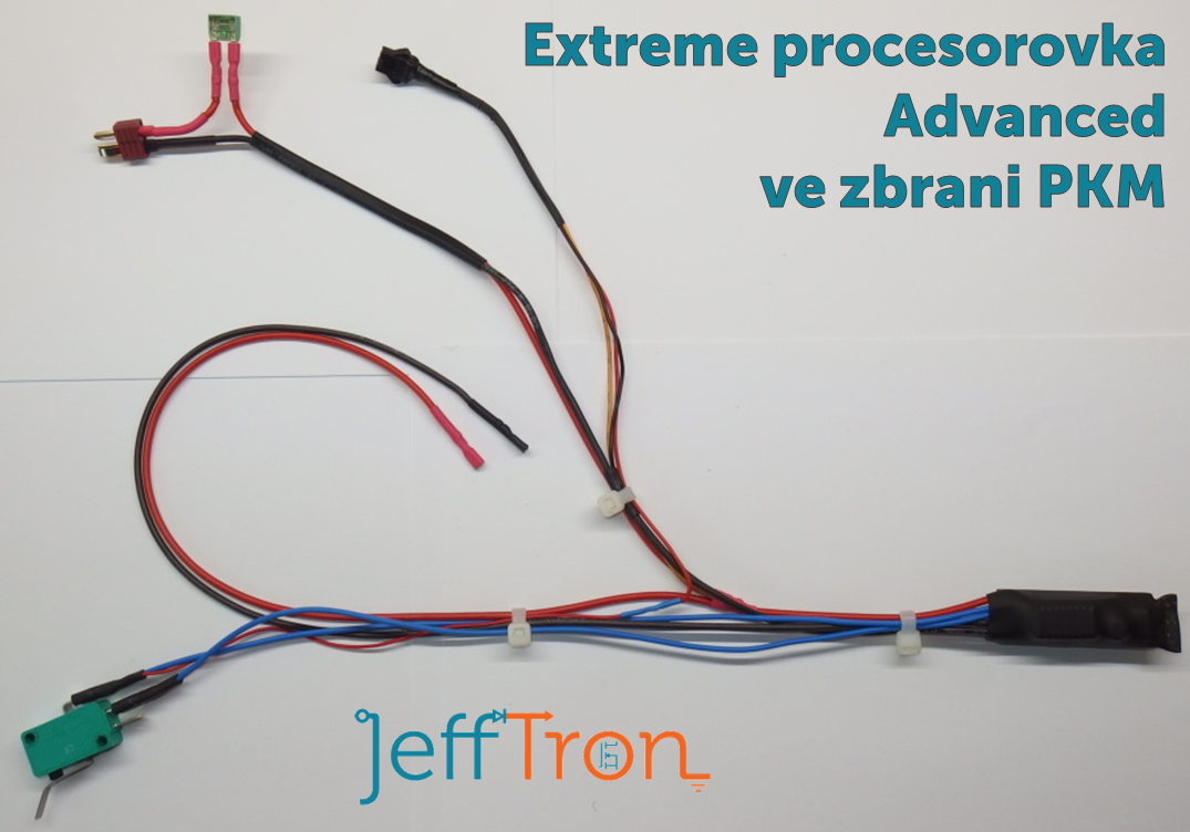 Na fotce je na zakázku vyrobená kabeláž s Extreme procesorovkou - Advanced u zbraně PKM s baterií umístěnou v zásobníku. Byl použit konektor pro napájení zásobníku a spoušťový kontakt z původní kabeláže. Sestavení kabeláže s procesorovkou je zdarma. Přikládám také foto původní kabeláže, která byla ve zbrani