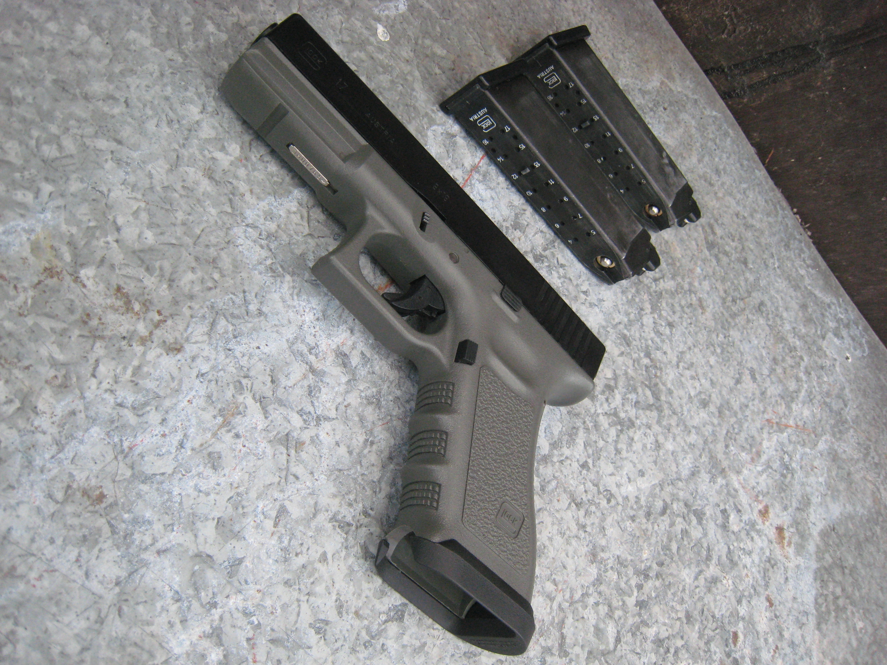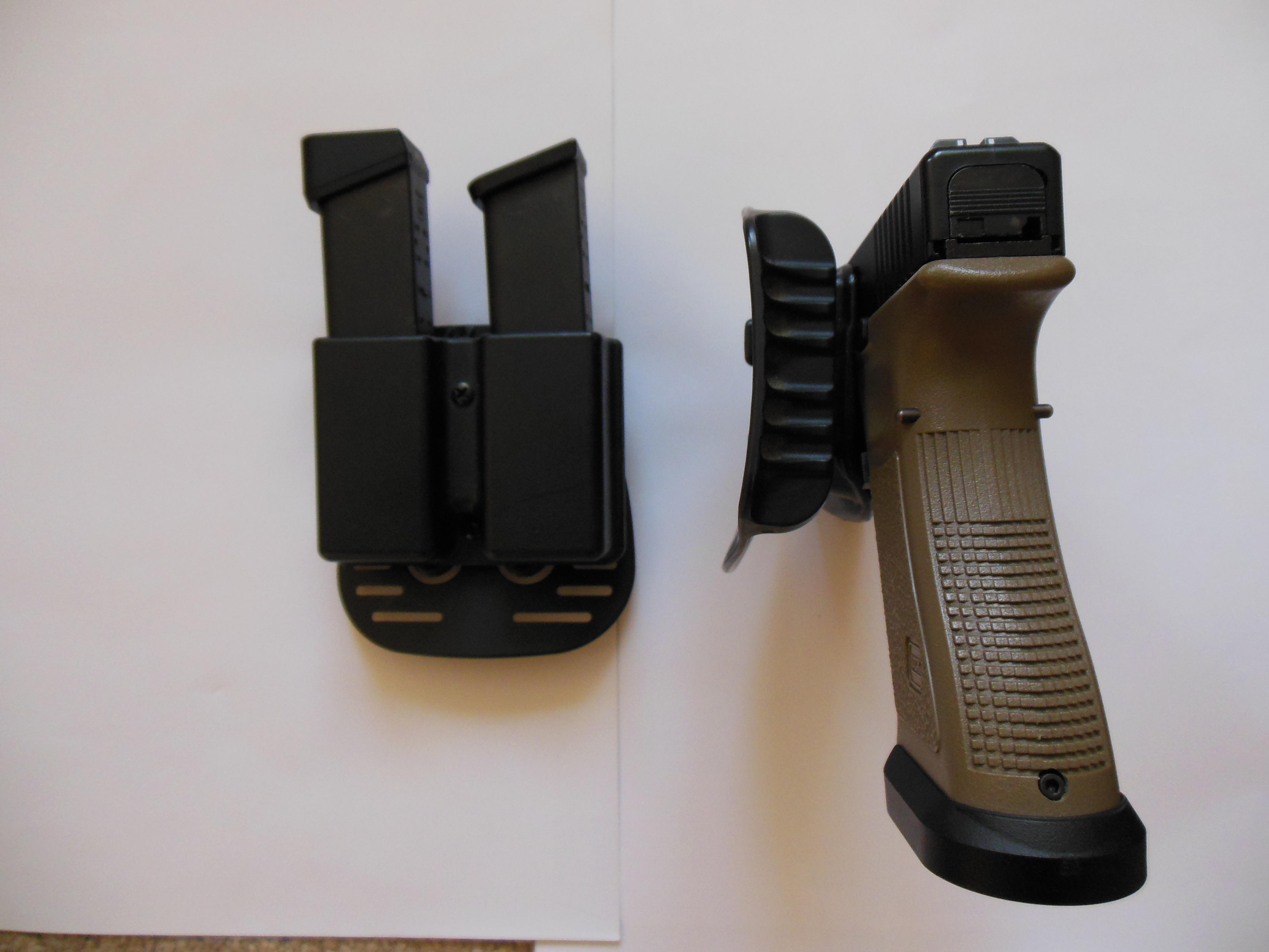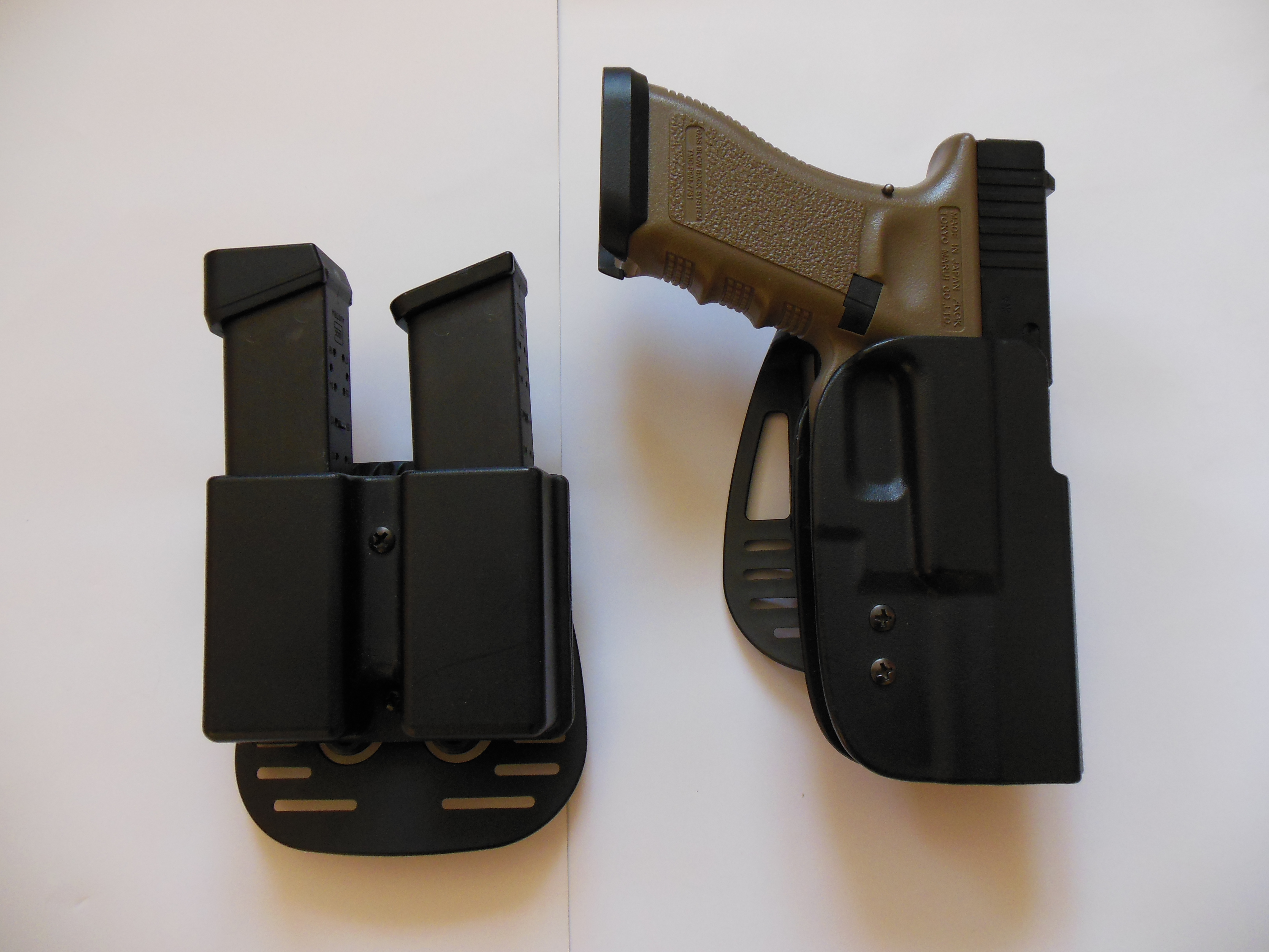 Tady je něco ode mne: TM Glock 17 Custom v základu. Pouzdro na zbraň i na zásobníky jsou od Uncle Mikes, vhodné mimo jiné i pro sportovní střelbu, protože poskytují dostatečnou mezeru mezi zbraní a tělem, což umožňuje dobrý úchop zbraně a její tasení narozdíl třeba od pouzder zn. Fobus, které jsou blíže k tělu a jsou lepší pro skryté nošení. Na zbrani chci v co nejbližší době udělat full upgrade.