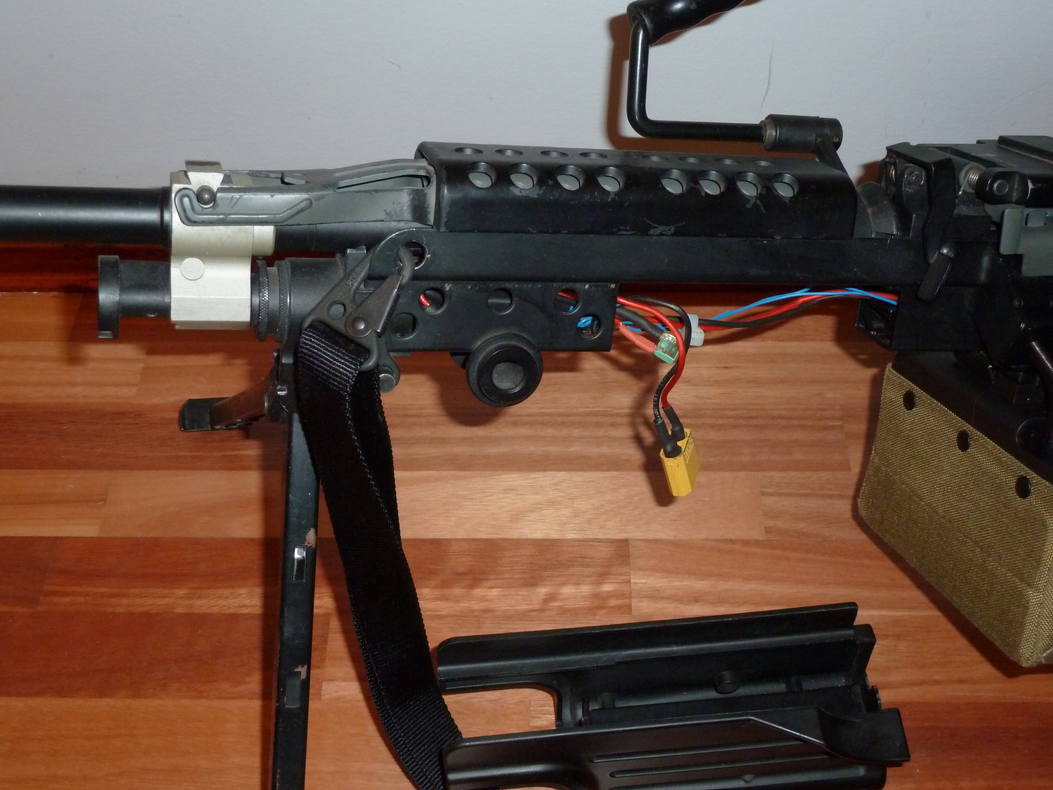 Tenhle mod zásobníku je dobrej v tom že nepotřebuješ baterie. A vzhledem k tomu že zbraň dává kolem 8.5 V (1-2 A) stíhá dotáčet naprosto bez problémů. Jediná nevýhoda je že ho musíš natočit externí 9 v baterii a pak připojit ke kulometu, nebo rovnou připojit a 5 s střílet na prázdno