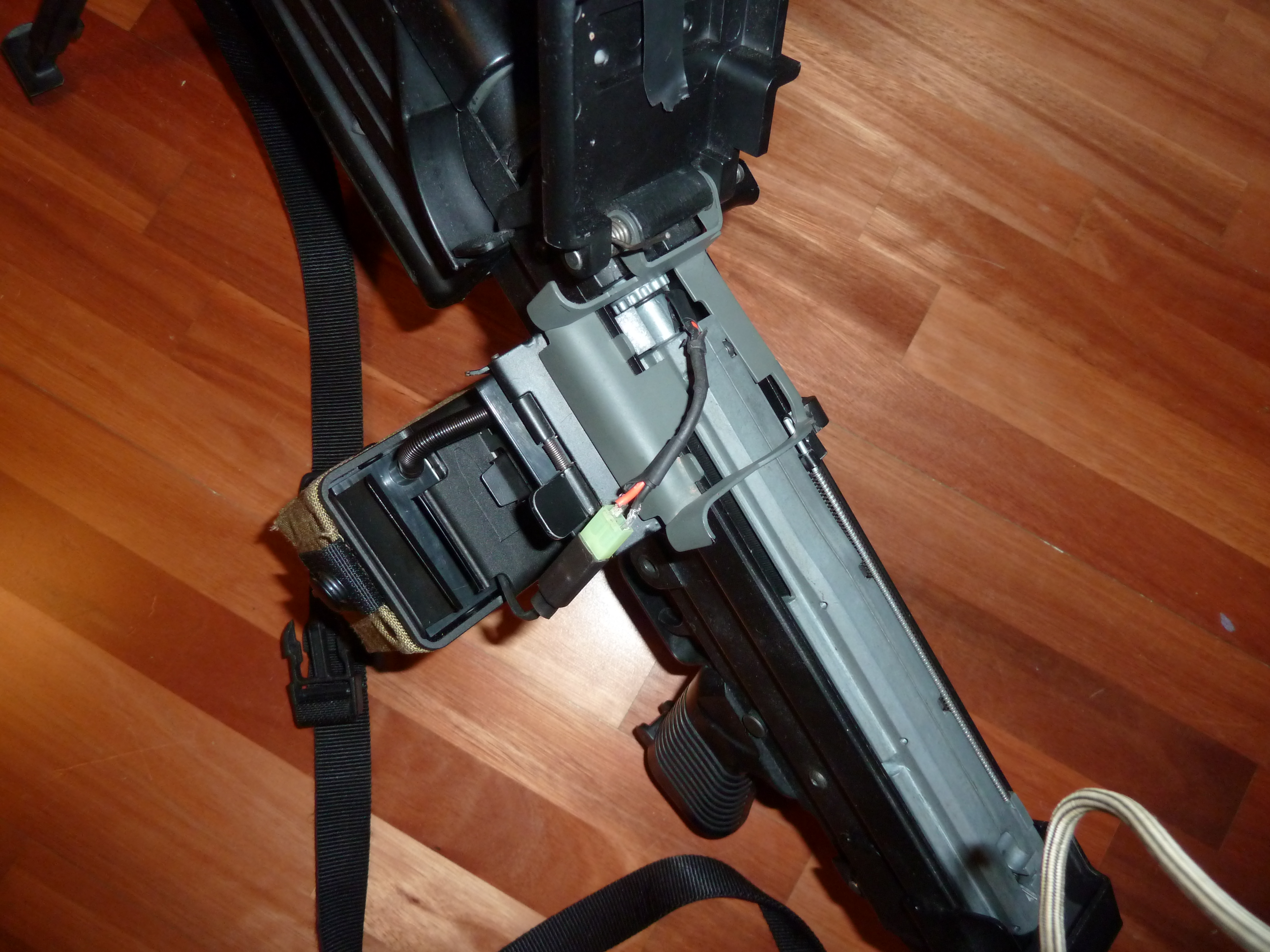 Zásobník je napojen na vodiče k motoru a odporem jen snižuju napětí. Kupodivu to funguje naporosto bezchybně (nevystřelím jediný ránu na prázdno). Ale původní spínací káblík je jen smotaný uvnitř a tlačítko je drženo plastovou svorkou. A koupil jsem drát co se nasazuje na 9v baterie a ten je napojen na konektor baterie v zásobníku. V bužírce co jde ven ze zábníku jsou dráty a odpor. Jestli máš zájem o návod jak MAG i standardní zásobník vylepšit mohu ho klidně napsat.