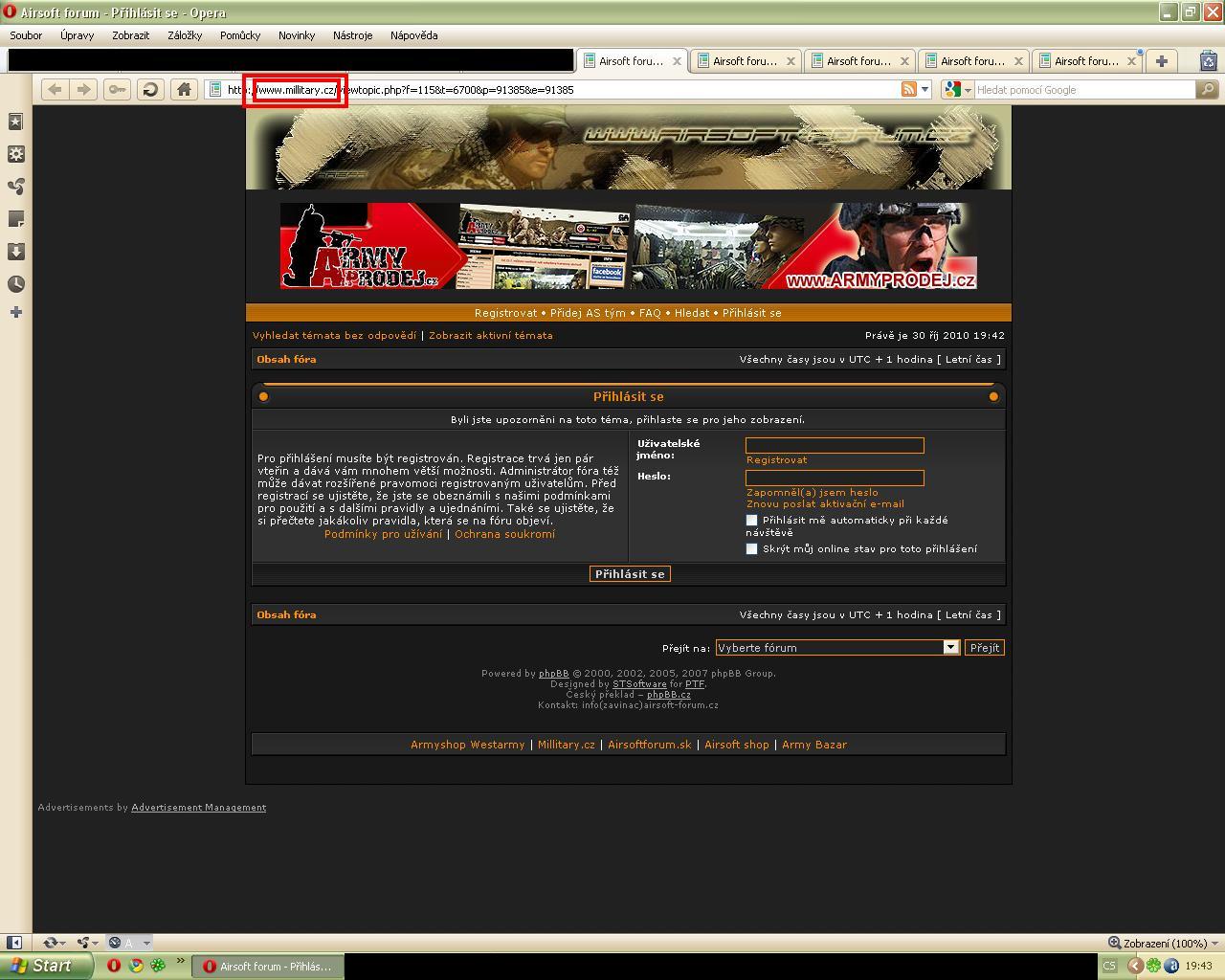 Zdravím, nevím, zda to s tím souvisí, ale poslední dobou se mi množí případy, kdy mi přijde email se sledovaným tématem, když kliknu na odkaz, tak se mi zobrazí přihlašovací okno (na tom by nebylo nic špatného, i když mám dané ,,trvale přihlášený"), ale problém je v tom, že místo odkazu http://www.airsoft-forum.cz se mi zobrazují jiné odkazy (viz příloha). Moje otázka tedy je, zda to nějak vadí, či ne? Děkuji za odpověď.