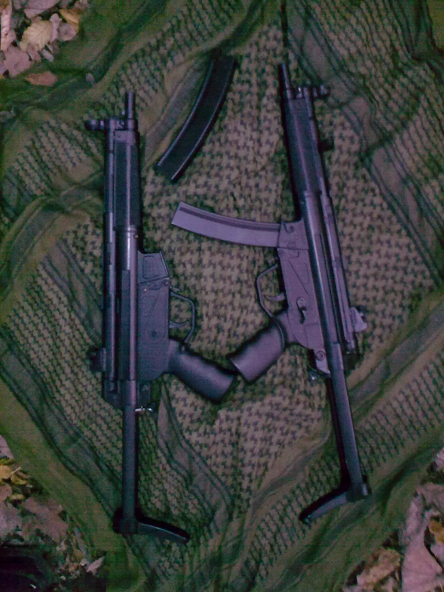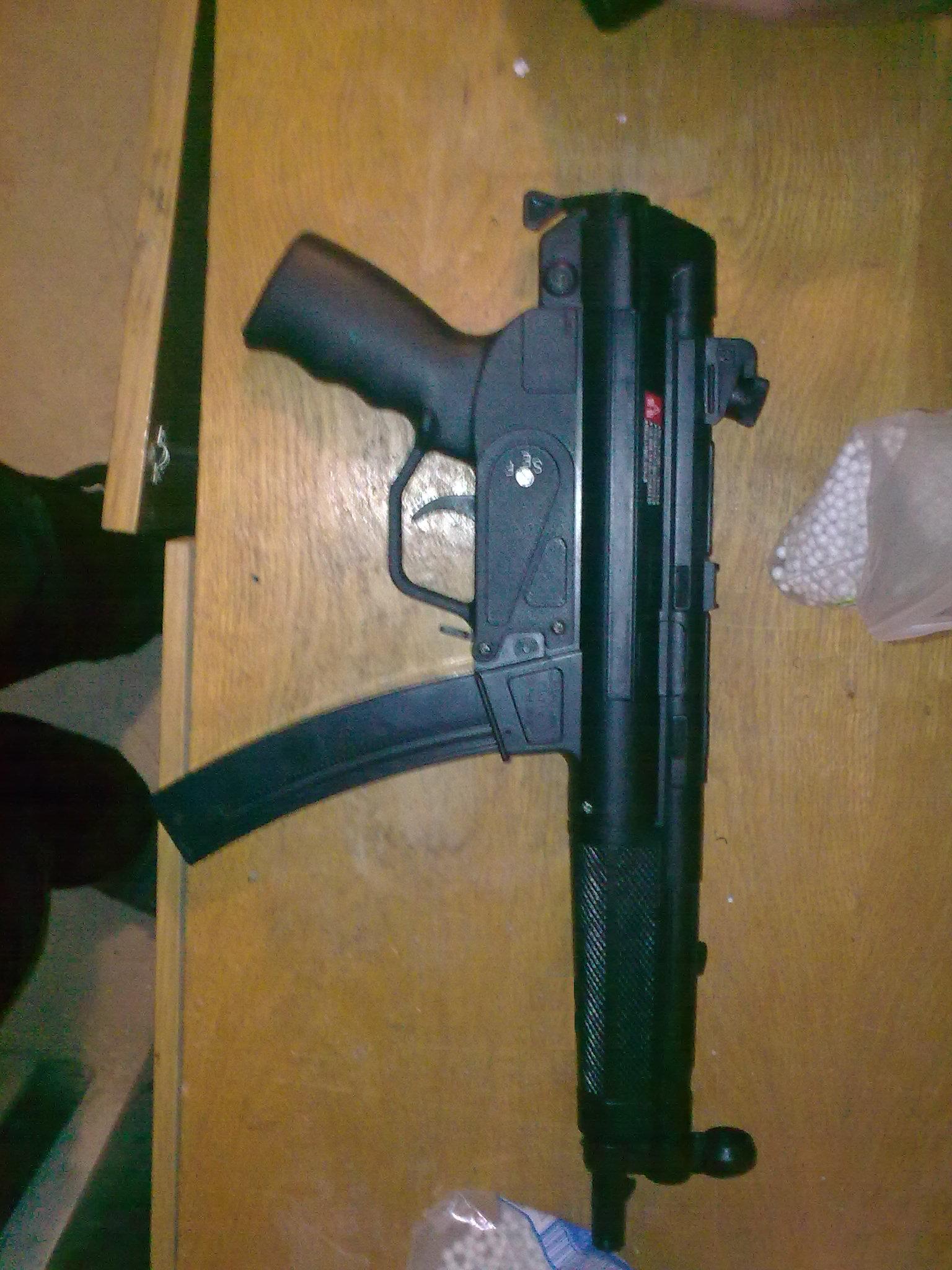 Upgrade: Velmi doporučuji zbraň rozebrat, to provedete tak, že zbraň položíme na stůl, aby její hlaveň mířila napravo od nás. Potom odšroubujeme mušku a pažbu a odšroubujeme 2 šroubky v rukojeti. Pak stačí odšroubovat tři šroubky a zbraň opatrně rozcvaknout. Když se tam něco uvolní, nezoufejte, fotka jak to má být je přiložena. Potom ze zbraně vytáhneme hlaveň a podložíme hop-up. Když budeme s podložením hopu spokojeni, podložíme tak o centimetr pružinu(přidávám pouze foto v základu-při upgradování jsem nefotil). Pružinu nejlépe podložíme tak, že tu tyčinku vzadu zbraně, na které je pružina na konci omotáme elektrikářskou páskou a potom ji seřízneme na míru. Pružina jde vyměnit(standartní m80) za m 130, ale to už je moc prasoupgrade. Když pružinu podložíte moc, nepůjde zbraň nabít. Potom zbraň sešroubujeme definitivně, musíme ji secvaknout, i když zbraň protestuje a vydává divné zvuky, stačí na to jen přitlačit, ale zase ne tak, aby jste ji zlomili. Další nutný začátečnický upgrade je následující: Dole na zásobníku je taková jako když plastový šroubek. Buď ho můžete šikovně zakápnout sekunďákem(ale fakt opatrně, ať neslepíte zásobník), nebo přelepit páskou. Tento „šroubek“ drží pružiny zásobníku, a není příjemné, když se zásobník v boji(v lese) rozstřelí a musíte hledat pružinky. Tento upgrade VELMI doporučuji, i když s MP5 budete střílet jinak v základu. Neprovedením tohoto upgradu riskujete ztrátu zásobníku. Velmi doporučuji další zásobník, protože když hrajete delší dobu, nebo proti lidem, co se dost kryjí, tak je i těch 42 ran málo. Zásobníky jdou buď slepit a vypadá to víc HUA, a nebo nosit třeba v kapse nebo sumce. Nevýhoda slepených zásobníků je ta, že jestli se plazíte nebo někde ležíte, tak zaručeně budete rýt tím druhým zásobníkem do země, a znečistíte první kuli, která následně zašpiní HOP-UP. Další upgrade(jak pro koho) je odmontování kolíku(je to taková pružinka a kolík, ale jde to zase přidělat) , co drží pažbu ve zbrani tak, aby nešla vytáhnout,když je mezi dvěma polohami-zasunuto, vysunuto. Pažbu jde zafixovat zasunutou nebo vysunutou. Jinak jde vytáhnout. Výhoda tohoto upgradu je, že máte MP5 s pažbou, která jde nosit buď zasunutá, nebo vysunutá. Hlavně ale jde oddělat.Kdykoliv, kdekoliv, snadno odděláte a přiděláte. Oddělání pažby používám v případě CQB a hlavně při boji na metr. Ta MP5 je totiž tak „dobře“ navrhnutá, že pro člověka , co má větší ruce není držení zbraně se zasunutou pažbou moc pohodlné, téměř nemožné. Bez pažby ale není možné střílet efektivně a přesně rychlopalbu(natahuju a mačkám rychle spoušť, mířím podle toho, kam dopadají kuličky), ale zase nemusíte vystrkovat celou ruku a v budově, nebo v malém prostoru se s ní lépe manévruje. S pažbou je to zase lepší na delší vzdálenosti. To pak se zbraní jde střílet podle dopadajících kuliček a hlavně se nemusí tolik mířit. Jakmile se naučíte mířit celou zbraní, máte vyhráno. Samozřejmě, že s pažbou se zvedne i přesnost rychlopalby. Nejlepší je našroubovat si tam sklopnou pažbu z MP5 PDW nebo MP5A5, k čemu se časem dopracuji.
