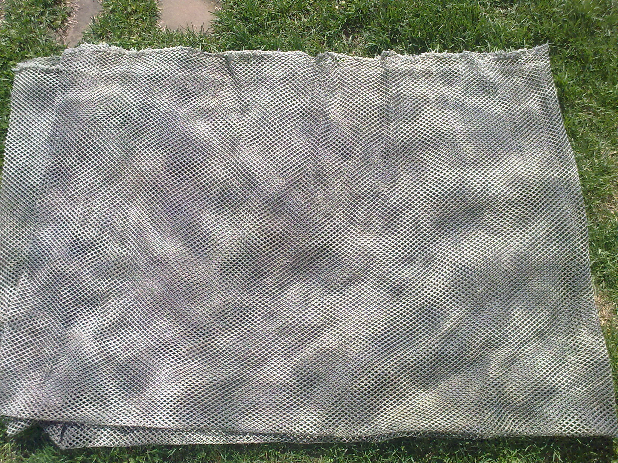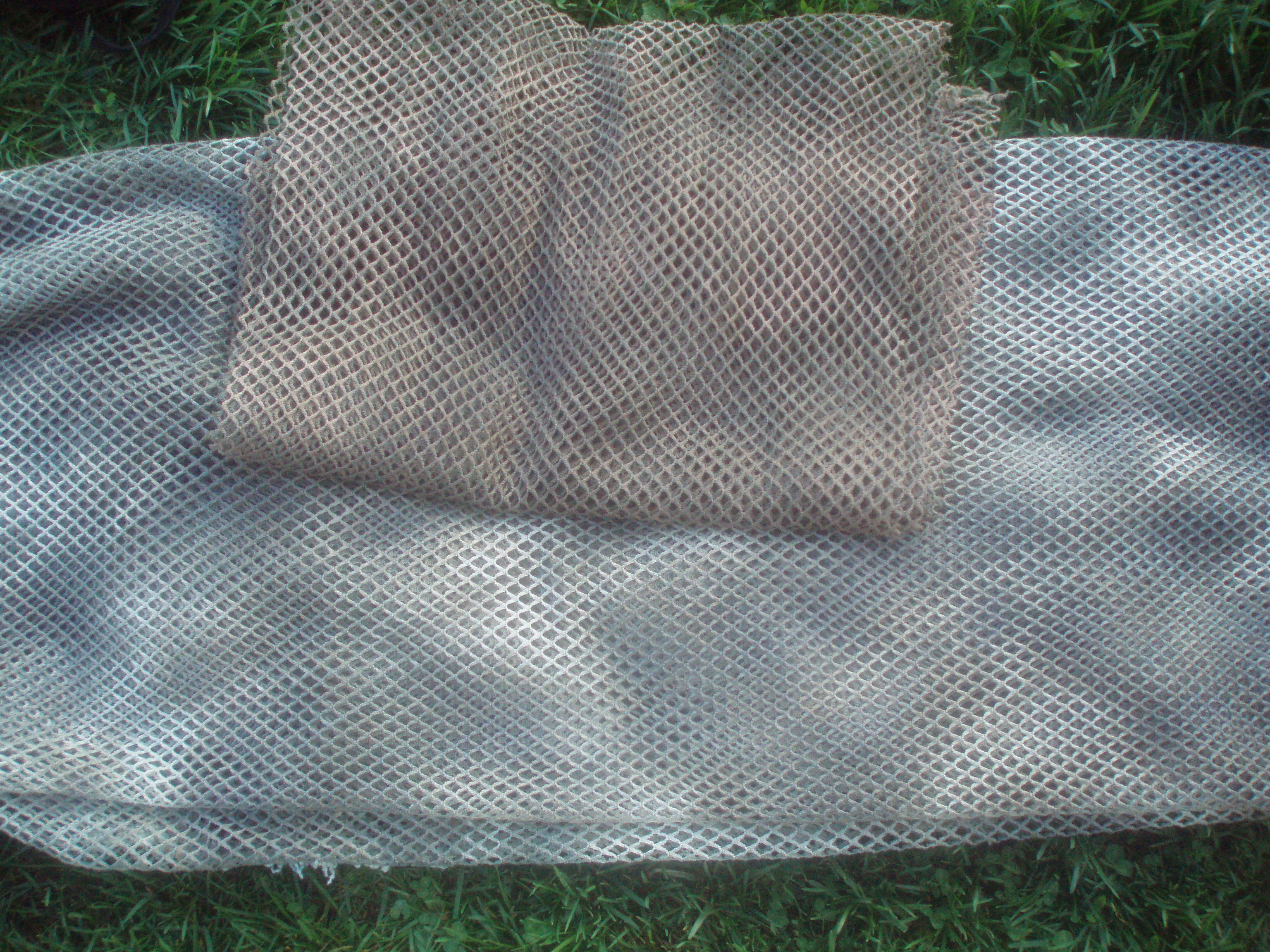 najprv sa mi to zdalo dosť svetlé , ale sú na tom origo. pekné "fleky" , a napadlo ma že to tiež zafarbím na hnedo spolu z Jutou a bude to fajn tmavé. Pevnosť je viac než dobrá , zatiaľ sa mi to nepodarilo roztrhnuť , aj keď neviem presne určiť materiál , ale asi to bude nejaká kombinácia z nylonom. Cena vychádza 5,5eura za 1m x 1,5m široký návyn. 4 m2 snaď budú stačiť aj do zásoby a uvydíme časom čo to znesie.