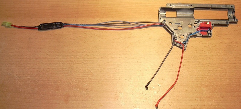 Na fotce je na zakázku vyrobená kabeláž s mosfetem (umístění vedle hop-up komory) pro zbraň AKS74 s baterií nad mechabox nebo na kovovou sklopnou pažbu, kabeláž byla montována přímo na mechabox, který zázazník poslal.