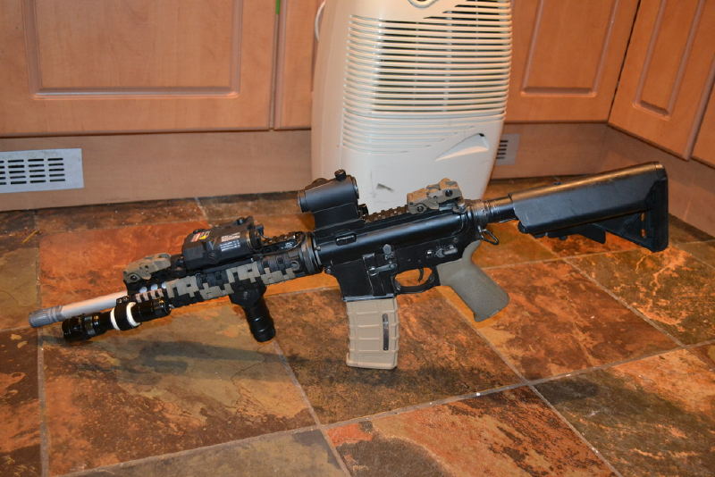 Nicméně pak je samozřejmě potřeba dát nějaký freefloat předpažbí, klasický M16kový nemáš jak přidělat, pokud na kvéru nemáš přední mířidlo.