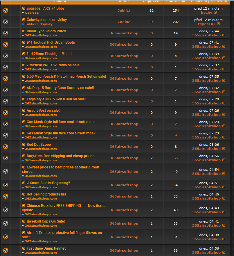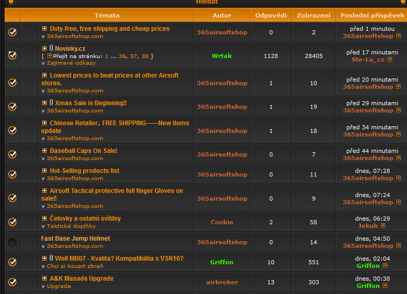 Je sice fajn ze se tu propaguje nejaky 365airsoftshop, ale za hodinu naspamovat 10 temat, je trochu fest. Jestli hodlaji na kazdou novou polozku zakladat nove tema, tak forum bude tak zasekane, ze se v tom ani prase nevyzna. nechce jim nekdo z poverenych vysvetlit at to delaji tak jako kolegove z airsoftparku? tzn. novinky hazet do jednoho vlakna. takhle rano prijdu na forum, kliknu aktivni temata a mam naspamovanou celou stranku kktin ktere me absolutne nezajimaji a nemaji s timhle forem spolecneho zhola nic. jeste pribydou dva tri takovi a muze se rovnou zmenit domena na www.reklamni-airsoft-forum.cz.