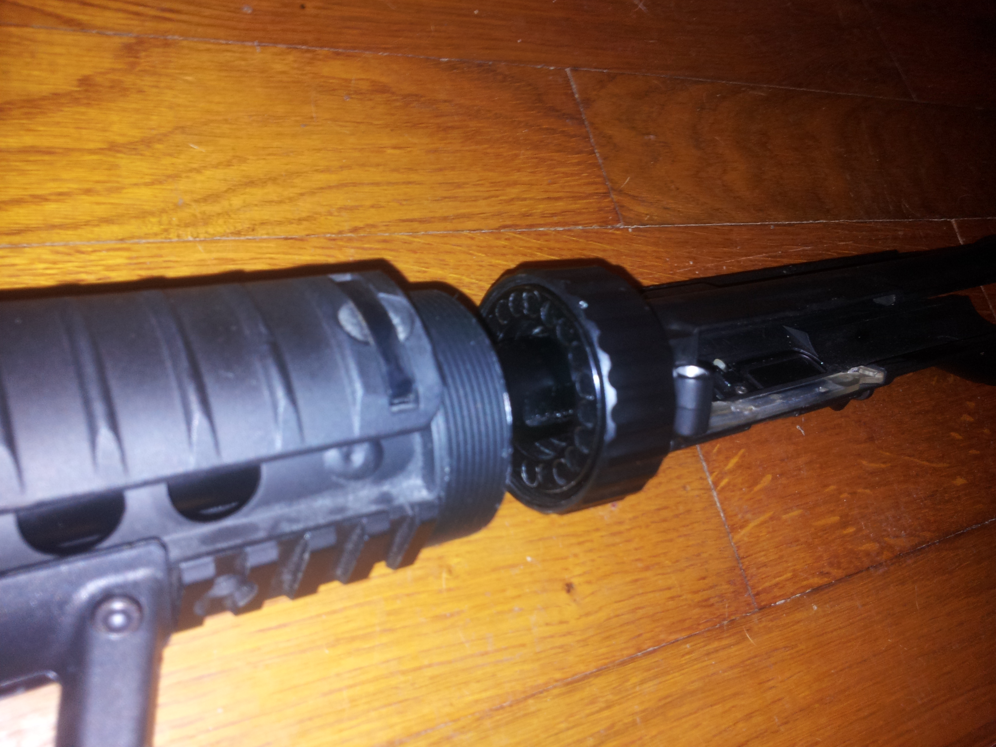 Nicméně je potřeba povolit "barrel nut", což je ta zubatá část prstence držícího předpažbí.
