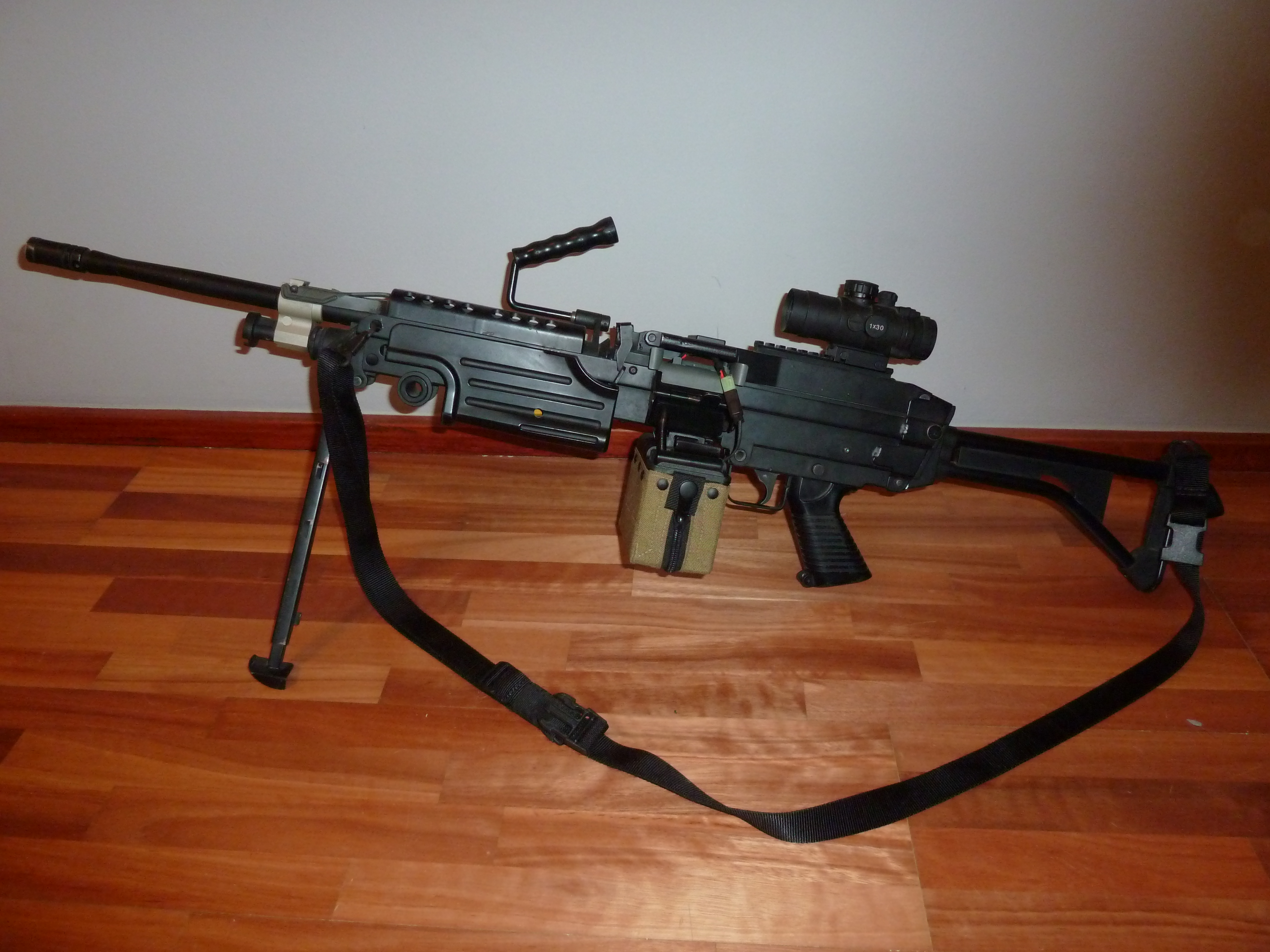 ÚvodKulomety se mi vždy líbily. A na většinu akcí na které jsem dorazil žádné nebily, nebo jen v základu. Musel jsem se připravit do kulometu hodně zainvestovat, aby měl slušný výkon + munice. Ze všech dostupných značek jsem zvolil CA (Classic Army) verzi mk II. Kamarád mi doporučoval A&K což je až na mechabox úplně totožné - i slitina těla je stejná. Ale CA je prostě klasika. ZpracováníZa zpracování si výrobce rozhodně zaslouží uznání. V první řadě je tělo z jednoho kusu ocely takže se vám nikdy nebude kývat, skřípat nebo jak tomu u předpažbí M4 říkám nezhadovatí. Párkrát už mi spadnu a nic nikde neupadlo nebo neprojevilo žádnou slabost. Jediným kamenem úrazu je pažba. Ta je totiž z plastu (jako u originálu) a uvnitř je na rozdíl od ostatních verzí baterie. Patka pažby je zajištěna opěrkou na rameno, takže po pár akcích upadla a už jsem jí nenašel a navíc do pažby 11.1 li-pol nenacpete. Mířidla jsou použitelná a dobrá. Kryt závěru tzv. feed cover drží a správně zapadá na svoje místo bez jakýchkoliv problémů. Natahovací páka je sice k ničemu, ale dělá hezký zvuk. Hlaveň je něco úžasného protože jí lze vyndat páčkou na boku zbraně, jako je tomu u ostré zbraně. Na regulátoru v plynovém potrubí se bohužel nenachází potenciometr na řízení kadence jako je tomu u M60, takže nemá žádnou funkci. Jediné co je třeba vyměnit je úchyt dvounožky za ocelový (otázka 600 Kč) Střelba v základuMechabox je černý (atypický) a všechno kromě pístu, hlavy válce a trysky je kovové. Zbraň mi střílela kolem 110 m/s a to je na kulomet opravdu dost málo. Hlaveň je 6.09 mm takže s přesností také moc nepočítejte, ale na tom u kulometu ani moc nezáleží. Spouštění je zajištěno standardním mikrospínačem který koupíte v jakémkoliv obchodu s elektronickými díly, proto se vám tu kontakty neopalují, ale daň za to že ke spoušť není spojena s mechaboxem, je že mikrospínač toho zatížení tolik nevydrží. Jak jsem již zmínil patka pažby se ztratila a tak tam baterie 9.6 v 1800 mAh držela izolepou. Přepínač střelby logicky chybí - kulomet střílí jen na full auto. Jediné co se dá ještě popsat je pojistka, která se nachází na masivní pažbičce a je oboustranná. ZásobníkK CA je dodáván jen standardní 300 raný zásobním standartu M4. Ale bez pořádné zásoby munice to není kulomet. Tak jsem zvolil zásobník od A&K, který byl levný (levnější než MAG atd.) a měl funkci sound control. Hned zde jsem narazil na problémy. Pokud je zásobník již nasazený, nelze zastrčit “kazetu” do šachty protože okraj se zadrhává o pojistku zásobníku. I systém sound control po čase odešel a navíc mi po upgradu zbraně zásobník ani nestíhal podávat. K tomu všemu je zásobník moc velký a trochu drhne o zem, takže střelba v leže byla dost problematická UpgradeBylo mi jasné že bude nutné rapidně zvýšit výkon. Protože jinak vám bude stačit Kalashnikov s bubnovým zásobníkem. Mechabox který do M249 dává firma A&K je podle specifikací odolnější než ten od CA. Proto jsem sehnal mechabox od A&K na M249. Většinu ostatní dílů jsem tedy nakoupil od značky ASG ultimate. S kterou mám dobré zkušenosti ze svých jiných zbraní. Koupil jsem nejdražší produktovou řadu, která je vyráběna v Evropě. Například jen kola (převodový poměr 40:1) stáli necelé 3000 Kč. Vzduchotechniku (ASG ultimate) jsem si sám sestavil (nekupoval jsem set). Motorek jsem pořídil vysokozátěžový Up-Parts a pružinu s progresivním vinutím od Guearderu (M150). A trysku jsem pořídil mosaznou od ASpro přímo určenou pro M249. Hlaveň jsem vyměnil za 6.02 mm od firmy Madbull. V neposlední řadě jsem zakoupil procesorovku basic extreme s univerzální kabeláží od firmy Jefftron. Procesorovka advanced přidává jen funkci aktivní brzdy a to je u kulometu k ničemu. Jako poslední jsem zakoupil z Red wolf airsoft zásobník od MAGu který je menší, má větší kapacitu a stíhá bez problému dotáčet i munici 0.30 g. Zásobník jsem pomocí speciálního kabelu na 9 v baterie a odporu (10 ohm) upravil, aby dotáčel automaticky a nepotřeboval žádné baterie. Šťávu dostává ze zbraně. Estetické úpravyOdpadlá patka pažby se mi nelíbila. Ani samotnou pažbu jsem si neoblíbil. Tak jsem od známého koupil za 500 Kč pažbu z verze mk I. Ta je kovová nic zní nemůže upadnout. A podle mě vypadá na kulometu líp než původní pažba. Baterii (11.1 1800 mAh Li-pol) vkládám do předpažbí, nebo pokud je kulomet použit stacionárně vyvedu kabel z předpažbí do externí baterie 11.1 v 5500 mAh. Mechanická mířidla také moc nevyhovovala, tak jsem přední i zadní sundal. V Morrisu mi na kryt závěru přidělali RIS lištu. Původní díry zasádrovali a přestříkali. Poté jsem zvolil tubusový kolimátor od Strike systems, který na kulometu vypadá opravdu dobře. ZávěrS M249 MK II převálcujete jako nic M60 i vz. 21. Pokud nemáte dost peněz abyste mohli provést upgrade vnitřku i vnějšku, tak si kulomet (jakýkoliv) nekupujte. Po tom co do něj dáte (včetně pořizovací ceny) něco kolem 20 000 Kč - 30 000 Kč. To bude nádherná a úžasná zbraň k nezaplacení. Nebo si ji necháte v základu a bude to stát za nic. U kulometu není nic mezi “nejlepší zbraň co jsem kdy držel” a “už abych se toho zbavil”. Takže pokud na to máte tak to kupte a “vytuňte”. Můžu vám ho jen doporučit! Video kde je ukázáno proudění kuliček v bowdenu: http://youtu.be/BcjOiloqLuYPříloha: