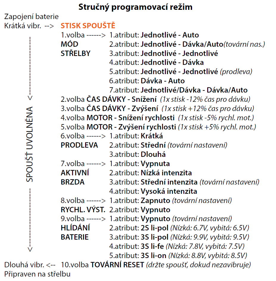 Za pár dní bude zahájena sériová výroba Procesorovky – V2. Nyní vám představuji její finální předprodejní variantu, která je shodná se sériovým výrobkem (bude pouze barevně odlišný). Procesorovka – V2 se pouze vloží do mechaboxu V2 místo původních spoušťových kontaktů (ve zbraních M4,M16,MP5, G3,SR25,….). Žádná další úprava mechaboxu není potřeba. Mechanické zajištění na SAVE je zachováno. Z důvodu takto jednoduché instalace se píst zastavuje při přepínači v poloze „AUTO“ v libovolné poloze (jako u běžné AEG). Omezení použití je do pružiny M160 a kadence 25 kuliček/s. Programově je zařízení shodné jako nyní prodávané procesorovky s následujícími přidanými funkcemi: -Není časová prodleva mezi dávkou a automatické střelbě (mód střelby 2), krátké zmáčknutí spouště znamená dávku, dlouhý stisk je automatická střelba -Nová funkce střelby: přepínač na SEMI = Jednotlivé/Dávka, přepínač na AUTO = Dávka/Auto -Aktivní brzda: vypnuta, nízká, střední a vysoká intenzita brždění. Vyšší síla brždění je vhodná pro zbraně s vysokou kadencí. Nižší naopak šetří komutátor motoru. Více fotek je na JeffTron facebooku: https://www.facebook.com/media/set/?set ... 717&type=1Návod na pro tuto procesorovku s vypisem a vysvětlením všech funkcí je zde: http://www.jefftron.cz/soubory/navod_pr ... ototyp.pdfvideo s funkcemi nyní prodávané procesorovky (kompletně přejímá prezentovaná Procesorovka – V2): https://www.youtube.com/watch?feature=p ... Msz-qAnqAUVývoj tohoto zařízení trval více jak rok a nedávno byly náročně testovány prototypy u 3 lidí. Všechny zařízení ustály testy bez poruchy i na pružine M160 s lipol 11.1V cca 150 ran najednou. Na základě jejich zpětné vazby byl vyvinut tento finální prototyp. Předpokládaná cena za tuto Procesorovku – V2: Samostatné zařízení 1250 Kč s DPH Zařízení s univerzální kabeláží 1500 Kč s DPH Uvedení na trhu v dubnu 2015