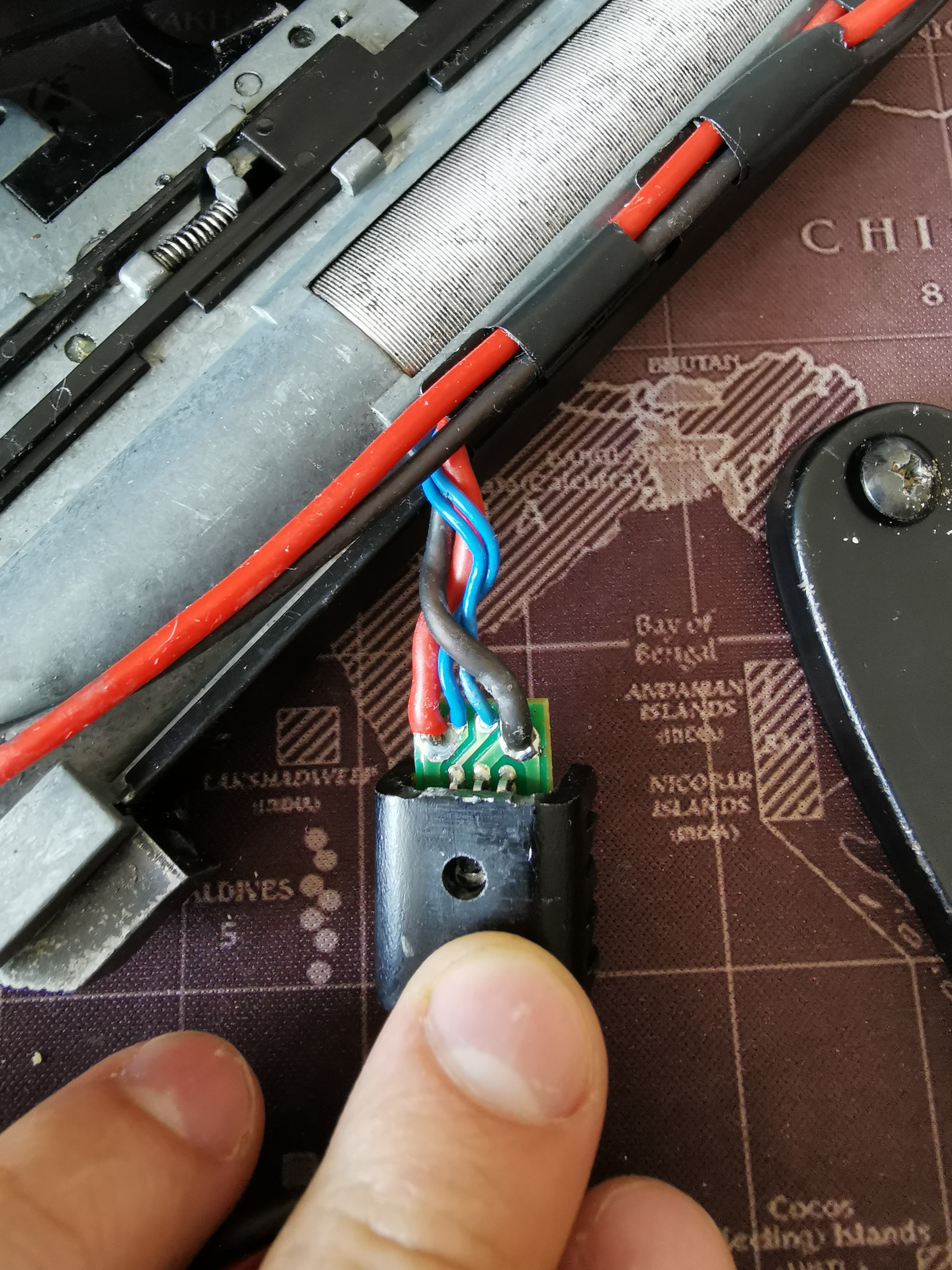 Ten původní co tam byl měl napájené 4 kablíky na tištěný spoj, od spouště šly 2 modré na tištěný spoj do 2 prostředních pozic a pak černý a červený od motoru na krajní pozice.