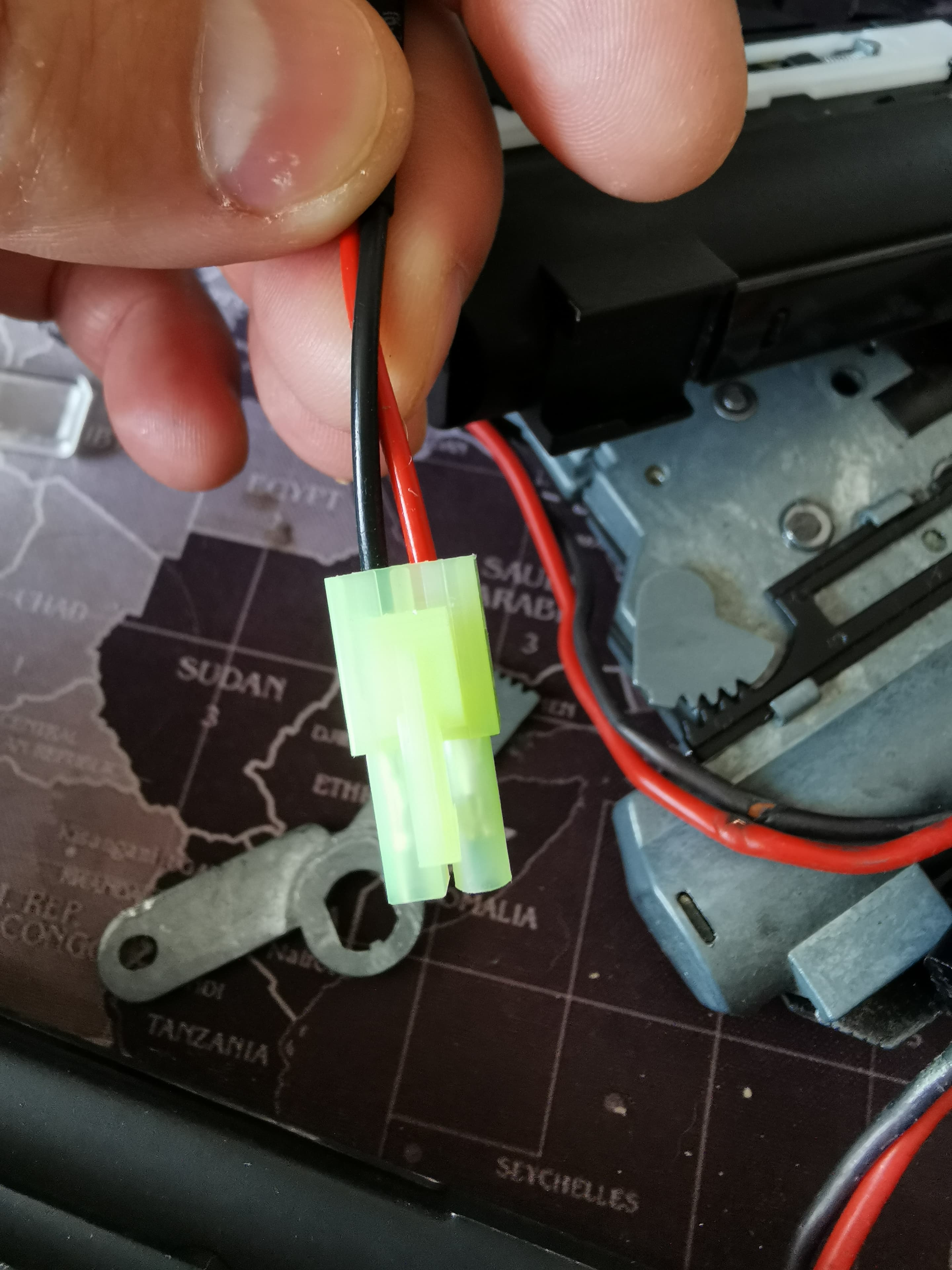 Ten nový jen konektor se 2 zavedenými kabely, červený od motoru propojený ke spoušti a dál od spouště do konektoru a černý přímo do konektoru.