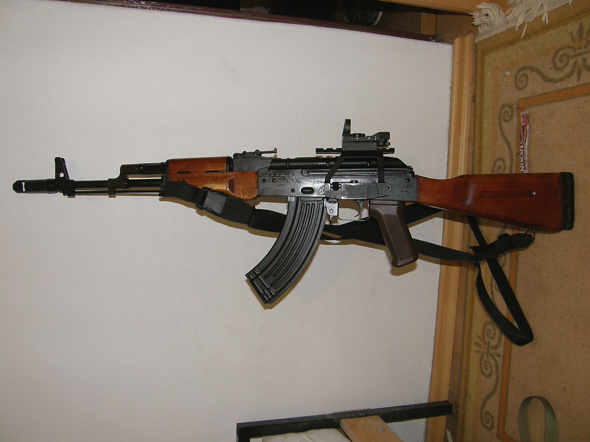 Chjo, další, co do AK-74 cpe zásobník z AK-47 . . . Kurňa chlapi to nevidíte, že se ty zásobníky liší zahnutím, kvůli rozdílnému střelivu ráží 5.45 / 7.62 ? Stará 74-ka se dřevem má mít méně zahnutý hnědočervený plasťák z polymeru. Jinak pěkný ''dřívko z Afghánu''.