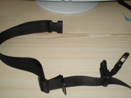 Nyní všechno pospojujte a výsledek by měl vypadat zhruba takto.Ještě z těch dvou 30cm popruhů udělejte taková oka,která budou spojovat popruh a zbraň.Jedno dáte na tu klipsnu.A druhé na tu spojku (je to ta o které jsem mluvil,že ji musíte a nemusíte použít)-klidně to oko na obrázku vpravo navlečte přímo na popruh (a ne na spojku)