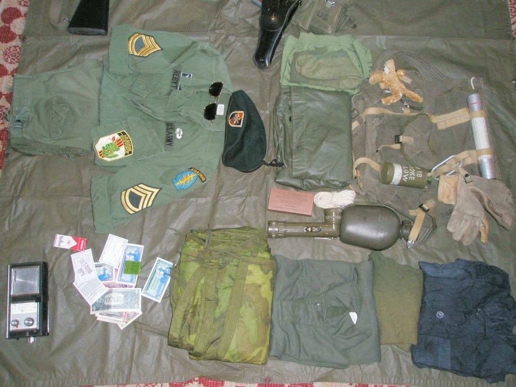 CIDG batoh, M159 fléra, M18 žlutej kouř, karabina a pracovní rukavice obsah batohu: černej vršek VC pyžama, OD triko náhradní, nylon sleeping shirt, ERDL poncho liner, HW poncho, náhradní ponožky, náhradní boxerky, MX-991/U baterka, trioxane, kus špagátu, 1QT lahev, ještě tahám c-rations ale došly na základně, vycházce: baret, piloťáky AO, tropická uniforma 3.model, nějaký ty legrační peníze (MPC), dolary, máčka, sirky, tranzistorák CROWN